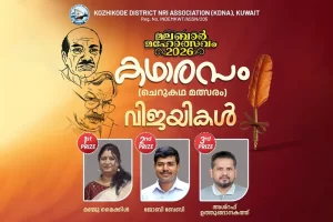 ASSOCIATION KUWAIT കോഴിക്കോട് ഡിസ്ട്രിക്ട് എൻ.ആർ.ഐ അസോസിയേഷൻ (KDNA) ‘കഥാരസം’ ചെറുകഥാ മത്സരം: വിജയികളെ പ്രഖ്യാപിച്ചു; February 9, 2026 News_Desk