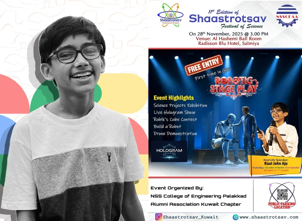 കുവൈത്ത് സിറ്റി : കുവൈത്ത് എൻജിനീയേഴ്സ് ഫോറത്തിന്റെ (KEF) കീഴിൽ പാലക്കാട് എൻ എസ് എസ് എൻജിനീയറിങ് കോളേജ് അലുമ്നി അസോസിയേഷൻ നാളെ നടത്തുന്ന കുവൈത്തിലെ പ്രമുഖ ശാസ്ത്ര–സാങ്കേതിക മഹോത്സവമായ 11-ാം ശാസ്ത്രോത്സവത്തിൽ മുഖ്യപ്രഭാഷകനായി AI Realm Technologiesയുടെ സ്ഥാപകനും CTO യുമായ റൗൾ ജോൺ അജു