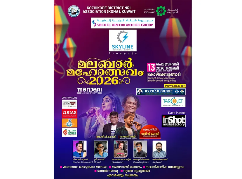 ഫെബ്രുവരി 13ന് അബ്ബാസിയ ഇന്ത്യൻ സെൻട്രൽ സ്കൂൾ ഓപ്പൺ ഗ്രൗണ്ടിൽ നടക്കുന്ന മലബാർ മഹോത്സവത്തിന്റെ പ്രധാന ആകർഷണം പ്രശസ്ത പിന്നണി ഗായിക മഞ്ജരി നയിക്കുന്ന “മഞ്ജരി ലൈവ് ഇൻ കൺസേർട്ട്” ആയിരിക്കുമെന്ന് സംഘാടകർ അറിയിച്ചു. മഞ്ജരിയോടൊപ്പം സരിഗമപ സീസൺ 2 ജേതാവ് സായന്ത് സജി, ആസിഫ് കാപ്പാട് തുടങ്ങിയവരും സംഗീത പരിപാടിയുടെ ഭാഗമാകും. കൂടാതെ പ്രശസ്ത നടനും നിർമ്മാതാവുമായ ഹരീഷ് പേരടി സാംസ്കാരിക സമ്മേളനത്തിന്റെ ഉദ്ഘാടനം നിർവഹിക്കും. മലബാറിന്റെ സമ്പന്നമായ സാംസ്കാരിക പൈതൃകവും കലാപാരമ്പര്യവും ഒരുമിപ്പിക്കുന്ന മഹോത്സവമാണ് കെ.ഡി.എൻ.എ സംഘടിപ്പിക്കുന്ന മലബാർ മഹോത്സവം.