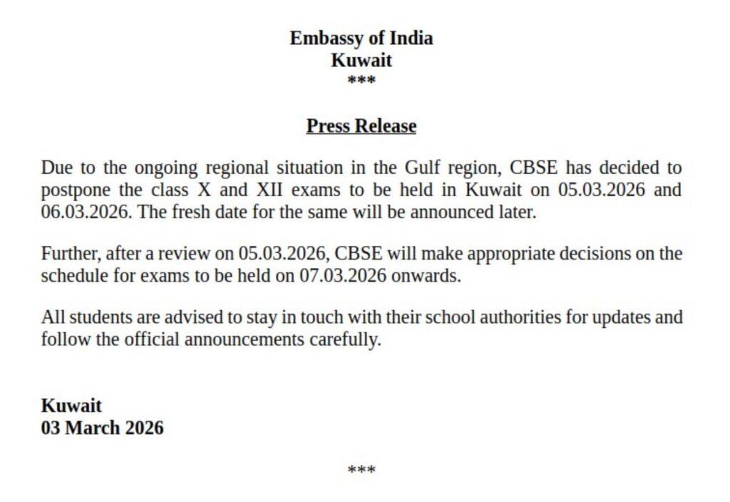 കുവൈറ്റ് സിറ്റി: ഗൾഫ് മേഖലയിൽ നിലനിൽക്കുന്ന പ്രത്യേക സാഹചര്യം കണക്കിലെടുത്ത് കുവൈറ്റിലെ ഇന്ത്യൻ സ്കൂളുകളിൽ നടക്കാനിരുന്ന സി.ബി.എസ്.ഇ പത്താം ക്ലാസ്, പന്ത്രണ്ടാം ക്ലാസ് പരീക്ഷകൾ മാറ്റിവെച്ചു. കുവൈറ്റിലെ ഇന്ത്യൻ എംബസിയാണ് ചൊവ്വാഴ്ച പത്രക്കുറിപ്പിലൂടെ ഇക്കാര്യം അറിയിച്ചത്.
