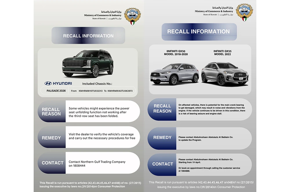 കുവൈറ്റ് സിറ്റി: സാങ്കേതിക തകരാറുകൾ കണ്ടെത്തിയതിനെത്തുടർന്ന് പ്രമുഖ വാഹന നിർമ്മാതാക്കളായ ഹുണ്ടായിയുടെയും ഇൻഫിനിറ്റിയുടെയും നിശ്ചിത മോഡലുകൾ കുവൈറ്റ് വിപണിയിൽ നിന്ന് തിരിച്ചുവിളിക്കുന്നു (Recall). ഉപഭോക്തൃ സംരക്ഷണ നിയമപ്രകാരം കുവൈറ്റ് വാണിജ്യ-വ്യവസായ മന്ത്രാലയമാണ് (Ministry of Commerce & Industry) ഇത് സംബന്ധിച്ച അറിയിപ്പ് പുറപ്പെടുവിച്ചത്.