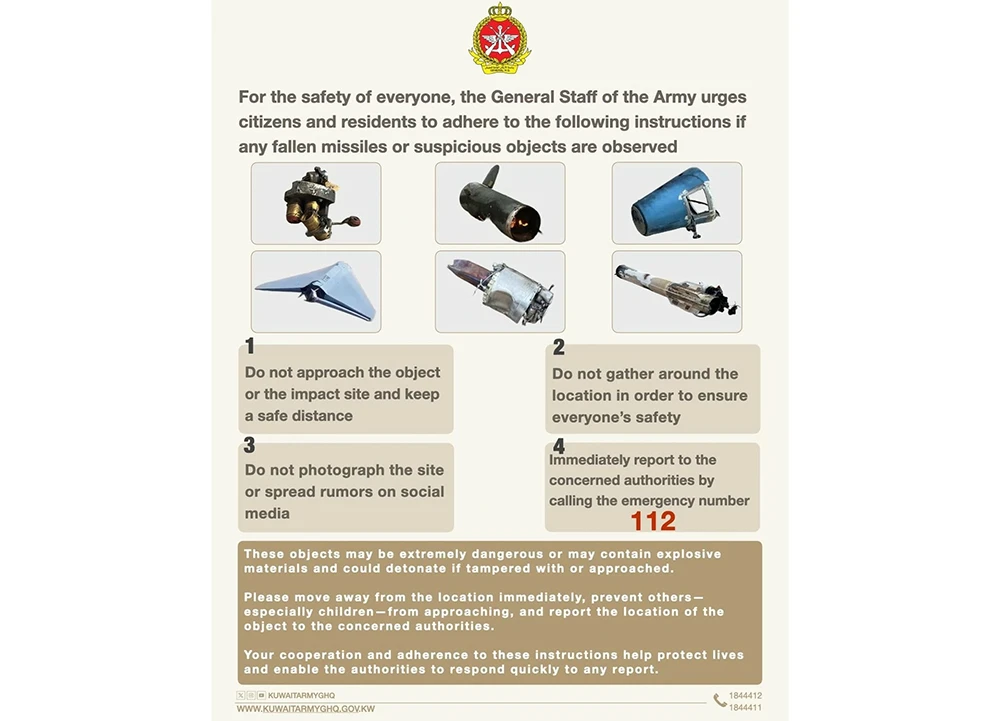 കുവൈറ്റ് സിറ്റി: രാജ്യത്തിന്റെ വിവിധ ഭാഗങ്ങളിൽ മിസൈലുകളോ മറ്റ് അജ്ഞാത വസ്തുക്കളോ വീഴുന്നത് ശ്രദ്ധയിൽപ്പെട്ടാൽ അവ കൈകാര്യം ചെയ്യുന്നതിൽ അതീവ ജാഗ്രത പാലിക്കണമെന്ന് കുവൈറ്റ് സൈനിക ജനറൽ കമാൻഡ് അറിയിച്ചു. ഇത്തരം വസ്തുക്കൾ കൗതുകത്തിനായി ശേഖരിക്കാനോ അവയ്ക്കരികിൽ കൂടിനിൽക്കാനോ പാടില്ലെന്ന് അധികൃതർ വ്യക്തമാക്കി. പൊതുജനങ്ങളുടെ സുരക്ഷ ഉറപ്പാക്കുന്നതിനായി സൈന്യം പ്രത്യേക മാർഗ്ഗനിർദ്ദേശങ്ങൾ പുറപ്പെടുവിച്ചു.