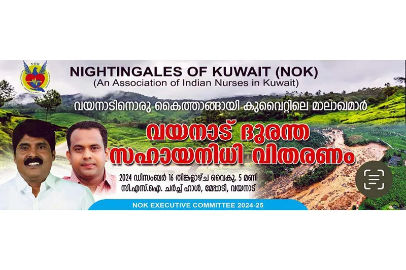 നൈറ്റിംഗേൽസ് ഓഫ് കുവൈറ്റ് വയനാട് ദുരന്തത്തിൽ പ്പെട്ടവർക്ക് വേണ്ടി സ്വരൂപിച്ച സഹായനിധി 6 ലക്ഷം രൂപാ അർഹതപ്പെട്ടവരായ 12 പേർക്ക് ഡിസംബർ 16 തിങ്കൾ വൈകിട്ട് 5 മണിക്ക് വയനാട് മേപ്പാടി CSI Church Hall യിൽ വച്ച് വിതരണം ചെയ്യുകയാണ്.