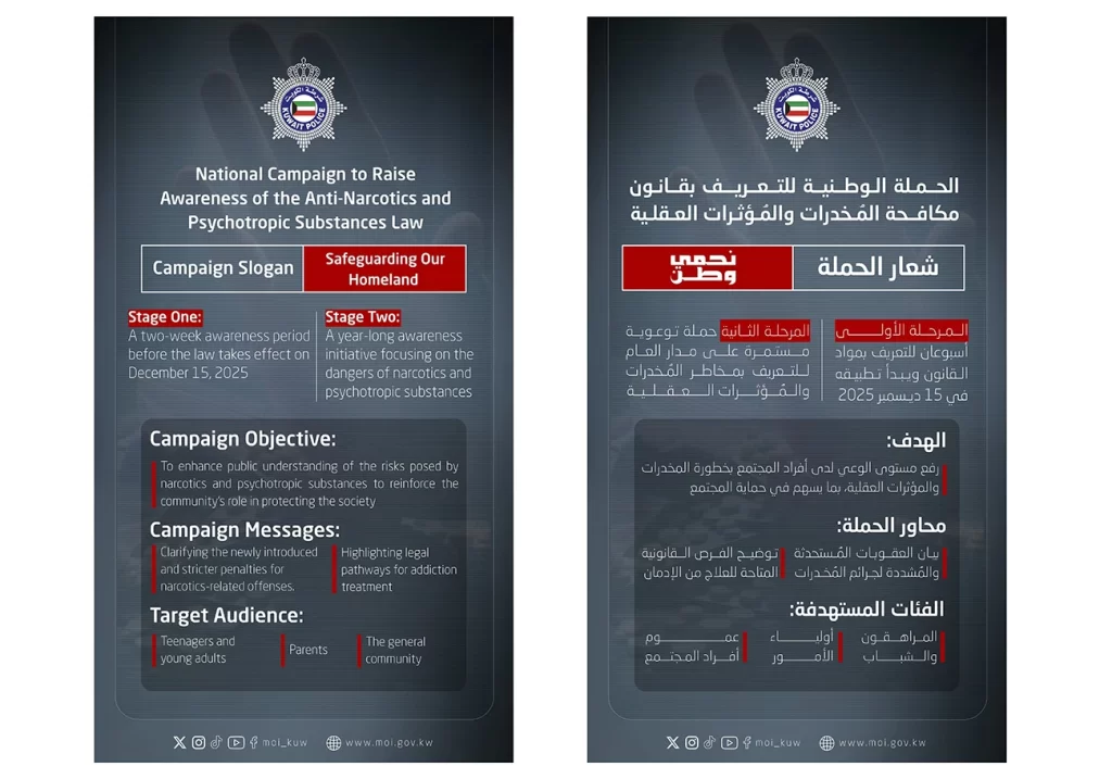 മയക്കുമരുന്ന് മാഫിയകളെയും വിതരണക്കാരെയും പിടികൂടുന്നതിനായി ആഭ്യന്തര മന്ത്രാലയത്തിന്റെ ജനറൽ ഡിപ്പാർട്ട്മെന്റ് ഫോർ കൺട്രോൾ ഓഫ് ഡ്രഗ്സ് (ജിഡിസിഡി) രാജ്യത്തുടനീളം തീവ്രമായ സുരക്ഷാ പരിശോധനകൾ തുടരുകയാണ്. അടുത്തിടെയായി നിരവധി വൻകിട മയക്കുമരുന്ന് വേട്ടകൾ റിപ്പോർട്ട് ചെയ്തിട്ടുണ്ട്. കടത്തുകാർക്കും ഉപയോഗിക്കുന്നവർക്കുമെതിരെ ശക്തമായ നിയമനടപടികളാണ് അധികൃതർ സ്വീകരിക്കുന്നത്.