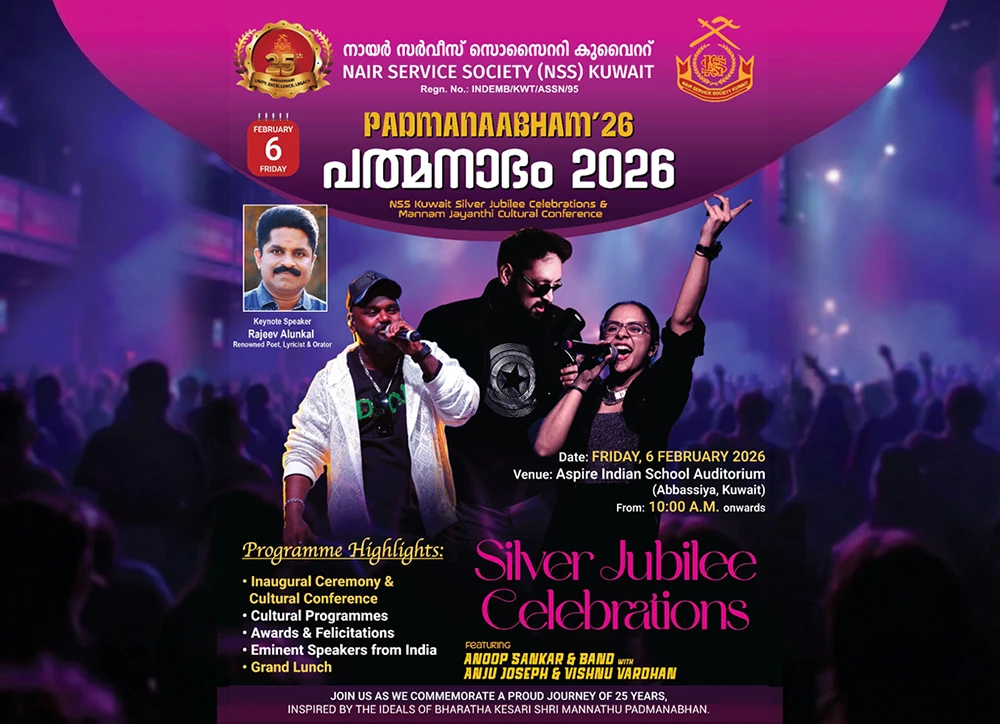149-ാമത് മന്നം ജയന്തി – രജത ജൂബിലി ആഘോഷങ്ങൾക്ക് ഒരുങ്ങി എൻ.എസ്.എസ് കുവൈറ്റ്.ഭാരതകേസരി ശ്രീ. മന്നത്ത് പത്മനാഭന്റെ 149-ാമത് ജയന്തിയും, നായർ സർവീസ് സൊസൈറ്റി (എൻ.എസ്.എസ്) കുവൈറ്റിന്റെ 25-ാം വാർഷിക ആഘോഷങ്ങളുടെ ഔപചാരിക ഉദ്ഘാടനവുമായ “പത്മനാഭം 2026” നാളെ ഫെബ്രുവരി 6-ന്, വെള്ളിയാഴ്ച, അബ്ബാസിയയിലെ Aspire Indian International School-ൽ വച്ച് സംഘടിപ്പിക്കും.