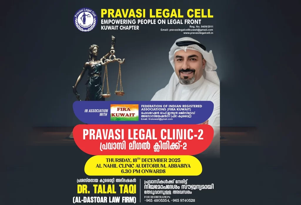 കുവൈറ്റ്: പ്രവാസി ലീഗൽ സെൽ കുവൈറ്റ് ചാപ്റ്ററും, ഫിറ കുവൈറ്റും സംയുക്തമായി സൗജന്യ ലീഗൽ ക്ലിനിക് സംഘടിപ്പിക്കുന്നു. 2025 ഡിസംബർ 18, വ്യാഴാഴ്ച വൈകീട്ട് 6:30 മുതൽ അബ്ബാസിയ അൽ നഹീൽ ക്ലിനിക് ഓഡിറ്റോറിയത്തിൽ വെച്ചാണ് പരിപാടി സംഘടിപ്പിക്കുന്നത്. പ്രശസ്ത കുവൈറ്റി അഭിഭാഷകൻ ഡോ. തലാൽ താക്കിയുടെ നേതൃത്വതിലാണ് പരിപാടി. പരിപാടിയിൽ പങ്കെടുത്ത് വിവിധ വിഷയങ്ങളിൽ കുവൈറ്റി അഭിഭാഷകരുടെ നിയമോപദേശം തേടുവാൻ താല്പര്യമുള്ളവർ 41105354, 97405211 എന്നീ നമ്പറുകളിലോ താഴെകൊടുത്ത ഗൂഗ്ൾ ഫോം വഴിയോ പേരുകൾ മുൻകൂട്ടി രജിസ്റ്റർ ചെയ്യേണ്ടതാണ്.