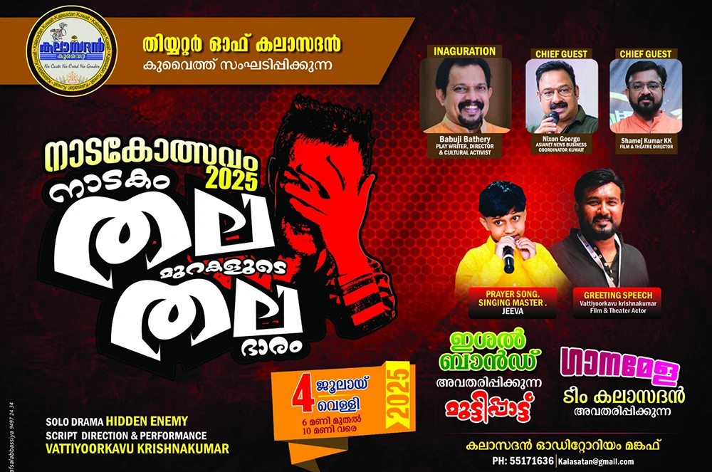 തീയറ്റർ ഓഫ് കലാസദൻ സംഘടിപ്പിക്കുന്ന നാടകോത്സവം ജൂലൈ 4-ന് വൈകുന്നേരം 6 മണി മുതൽ കലാസദൻ ഓഡിറ്റോറിയത്തിൽ